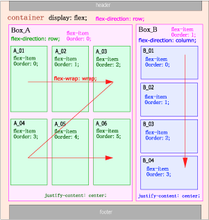 flex boxの基本構造は2種類の主軸。 縦方向(column) と横方向(row)。